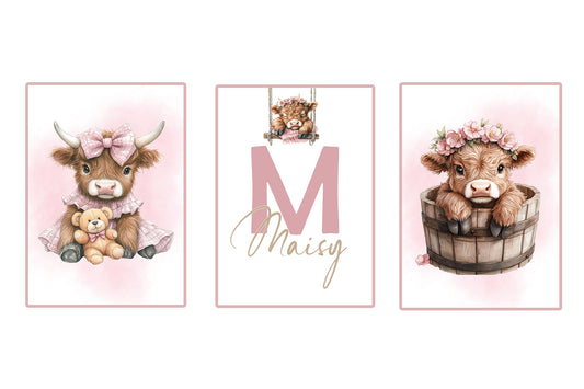 Personalised Highland Cow Nursery Wall Art Set – Custom Name Prints for Baby Girls