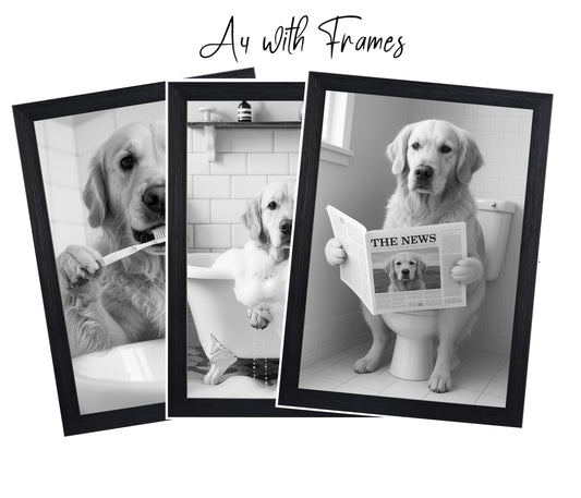 Golden Retriever Bathroom Wall Art Prints – Funny Dog Decor l A4 or A3 l Set of 3