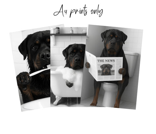 Rottweiler Bathroom Wall Art Set | Funny Dog Prints (A4 & A3 Options)