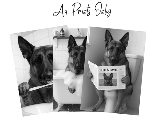 German Shepherd Bathroom Wall Art Prints – Funny Dog Decor l A4 or A3 l Set of 3