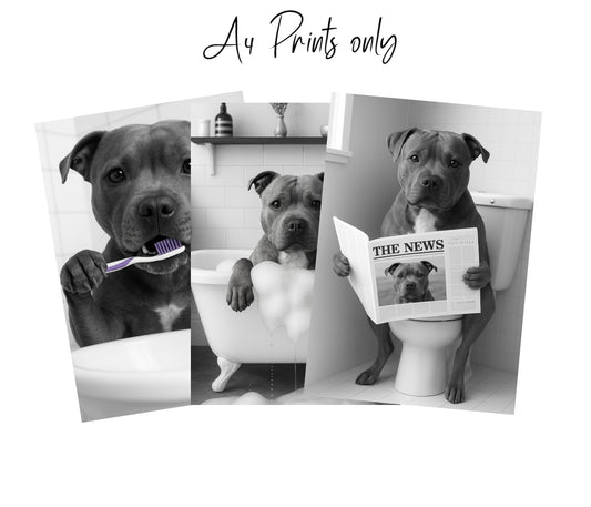 Staffy Bully Bathroom Wall Art Prints – Funny Dog Bathroom Decor (A4 & A3 Sizes)
