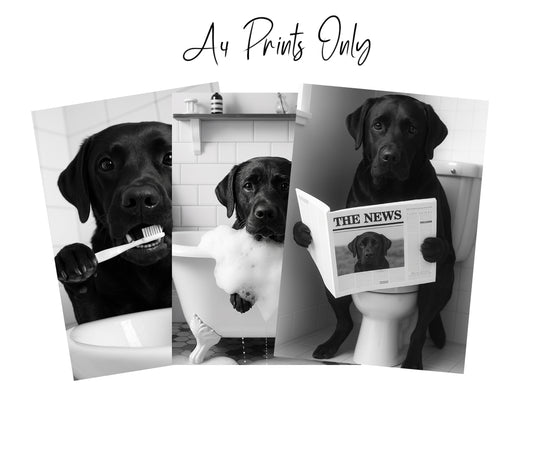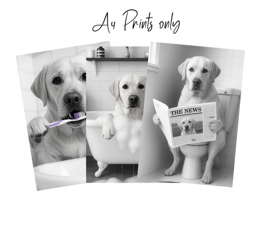 Labrador Bathroom Wall Art Prints – Funny Dog Bathroom Decor (A4 & A3 Sizes)