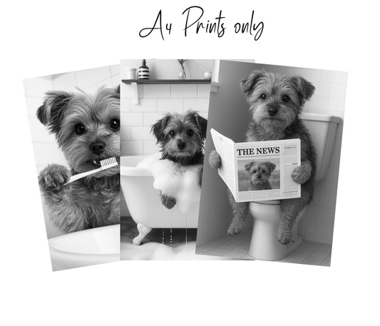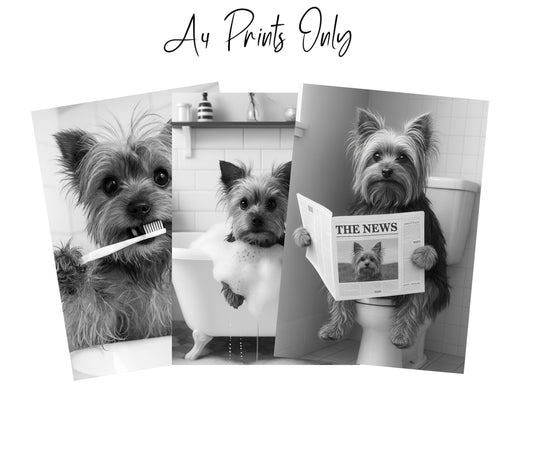 Yorkie Bathroom Wall Art Set – Black & White 3-Piece Print Collection