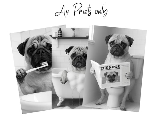 Pug Dog Bathroom Wall Art Prints – Funny Dog Bathroom Decor (A4 & A3 Sizes)