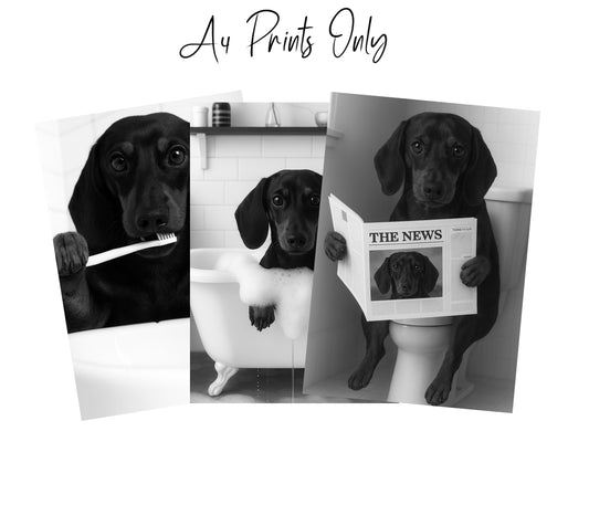 Dachshund Bathroom Themed Wall Art – Funny Dog Prints (A4 & A3)