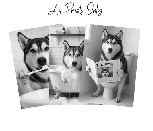 Husky Bathroom Wall Art Prints – Funny Dog Decor l A4 or A3 l Set of 3