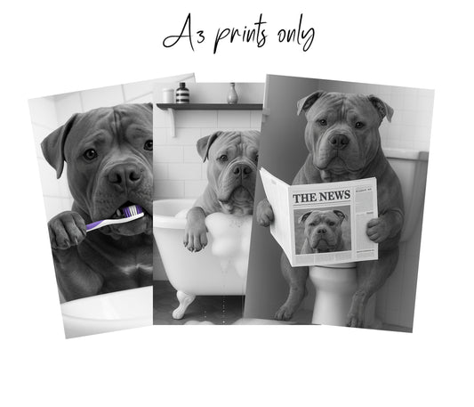 XL Bully Bathroom Wall Art Prints – Funny Dog Bathroom Decor (A4 & A3 Sizes)