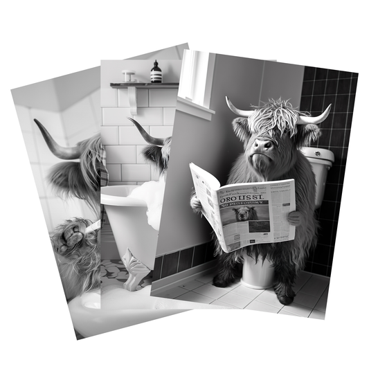 Highland Cows Gone Wild – Bathroom Edition | Set of 3 Black & White Prints