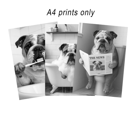 English Bulldog Bathroom Wall Art Prints – Funny Dog Bathroom Decor (A4 & A3 Sizes)