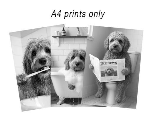Cockapoo Bully Bathroom Wall Art Prints – Funny Dog Bathroom Decor (A4 & A3 Sizes)