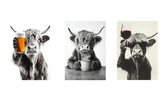 Highland Cow Trio Wall Art – Coffee, Beer & Wine Print Set