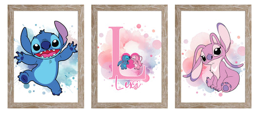 A4 Stitch & Angel Personalised Triple-Frame Set – Custom Name & Initial in Light Wood Effect Frames