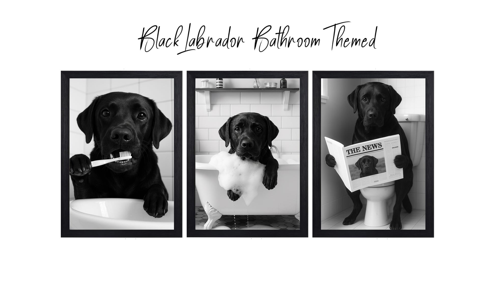 Bring a touch of humor and charm to your bathroom with this Black Labrador bathroom-themed wall art set. Featuring three playful black lab portraits – brushing teeth, relaxing in the bathtub, and reading the newspaper on the toilet – this artwork is perfect for dog lovers who want to add personality to their home décor.