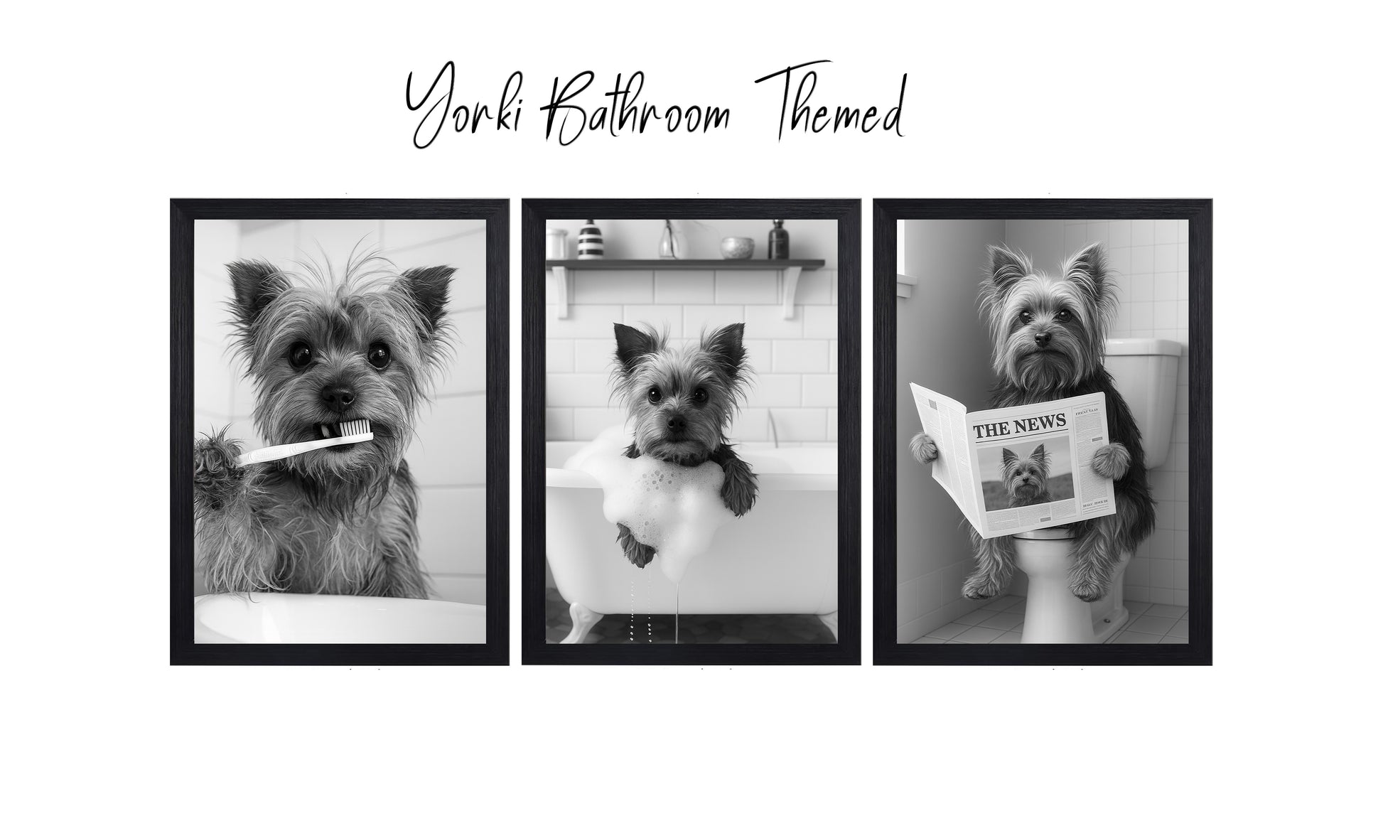 Yorkie Bathroom Wall Art Set – Black & White 3-Piece Print Collection
