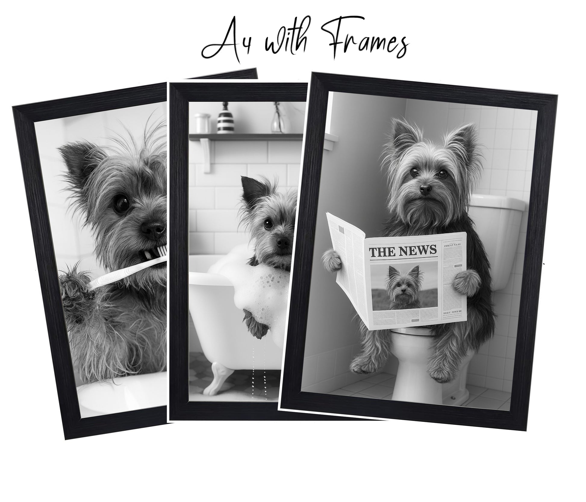 Bring playful charm to your bathroom with this adorable Yorkie Bathroom Wall Art Set. Featuring three black-and-white prints of a Yorkshire Terrier brushing its teeth, enjoying a bubble bath, and catching up on the news, this set is perfect for Yorkie lovers and pet-friendly homes. Each print comes framed and ready to hang, adding a fun, modern touch to powder rooms, guest baths, or dog grooming spaces. A unique gift for dog owners, housewarmings, or anyone who loves a little humour in their décor.